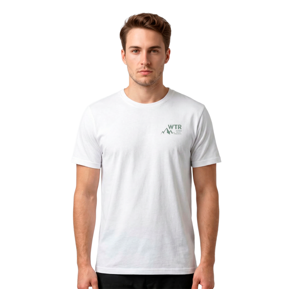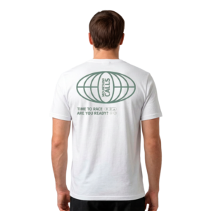 Camiseta branca com logo frontal discreta e estampa marcante nas costas, perfeita para um visual casual com inspiração esportiva e outdoor.